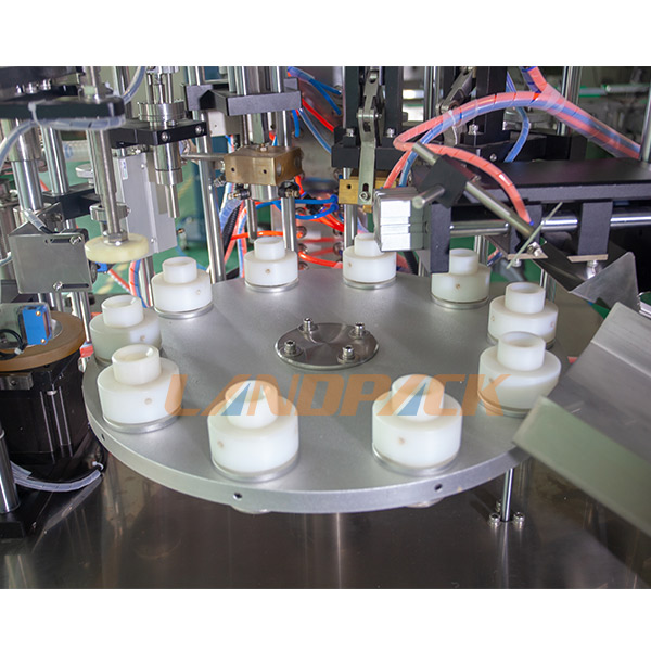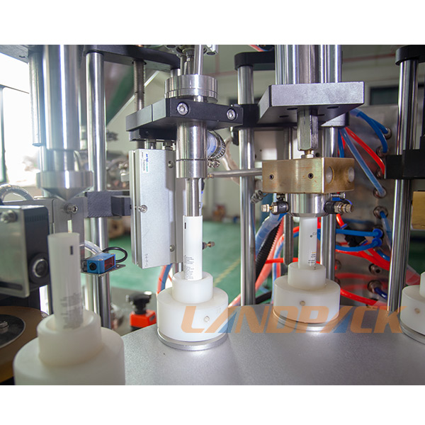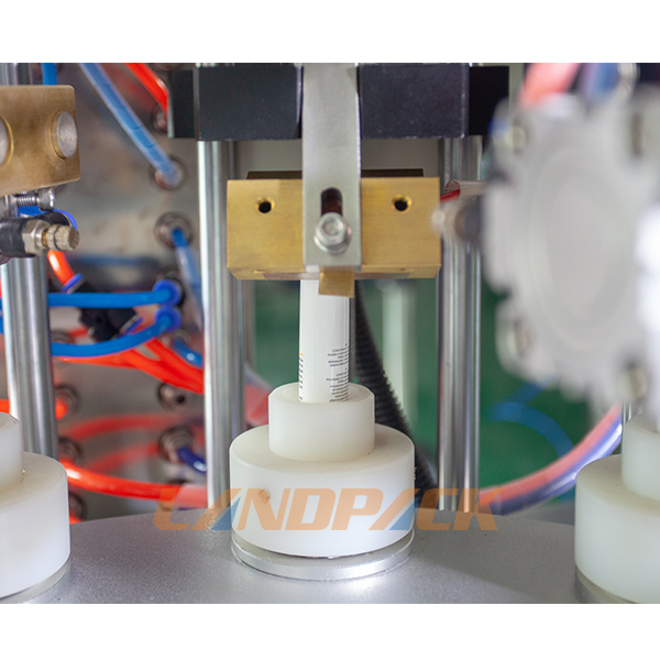 自动牙膏灌装封尾机采用PLC程序控制.自动上管、色标定位、空气清洗管内空间、注料喷嘴深入管内充填、管尾内壁热气加热、管尾外壁冷却(制冷水机排水循环)、热熔压合打字码、尾部剪切、成品排出。参数数字化显示。