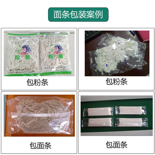 面条包装机属于半自动包装机,人工称好物料,投到输送皮带的收集斗,收集斗上安装了感应装置,感应到有物料了就开始包装,没物料则不包装,是一套比较经济实惠的包装系统。