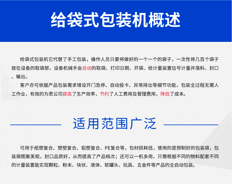 工作流程: 上袋→打印生产日期→开袋→充填1→充填2→空位→热封→整形及输出