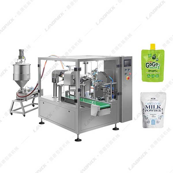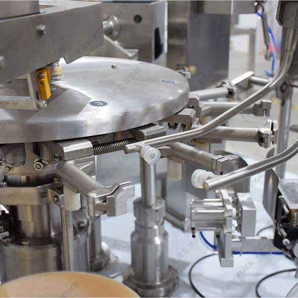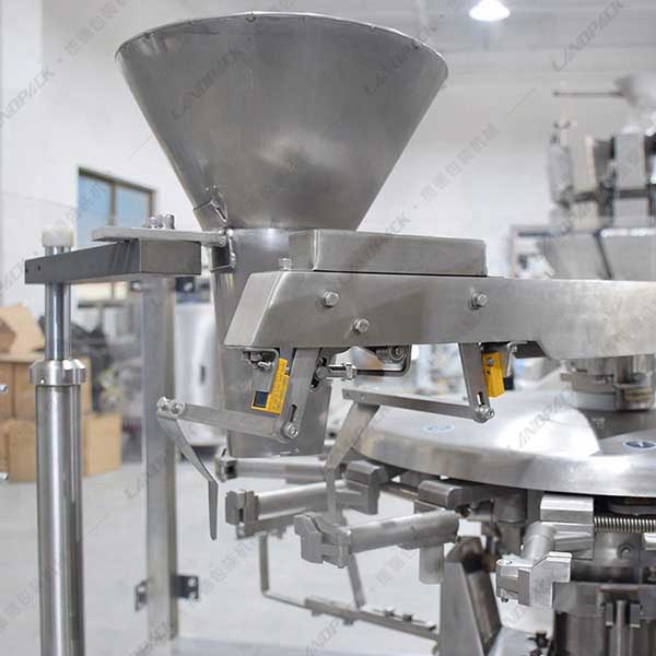 工作流程:上袋→打印生产日期→开袋→充填1→充填2→空位→热封→整形及输出