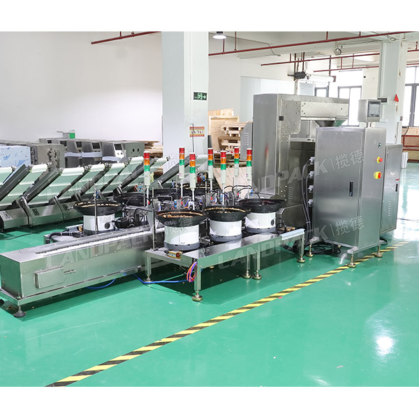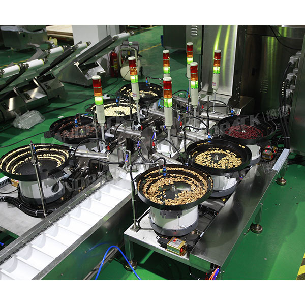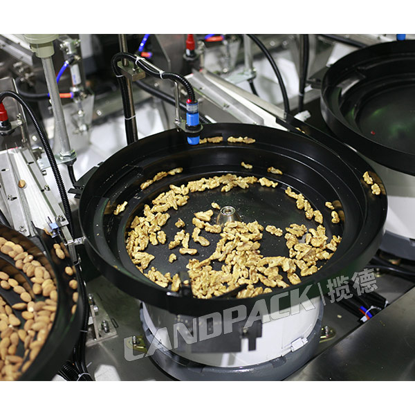 该台每日坚果包装机是由水平给袋式包装机主机、Z型自动上料机、震动盘三大件组成的,该机的工作流程是:操作人员把物料倒入震动盘当中,一袋包装多少种物料,就配置多少个震动盘,震动盘把物料输送到传送带当中,在通过Z型上料机把物料输送到袋子当中,然后进行下料,充填、打码、封口等一系环节完成包装过程。